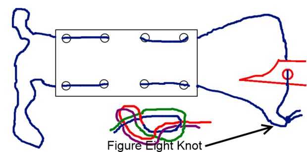 • Ponga un extremo suelto a través del agujero en el brazo y ate los extremos juntos. (Un doble rizo o cuadro ocho nudos funciona muy bien).