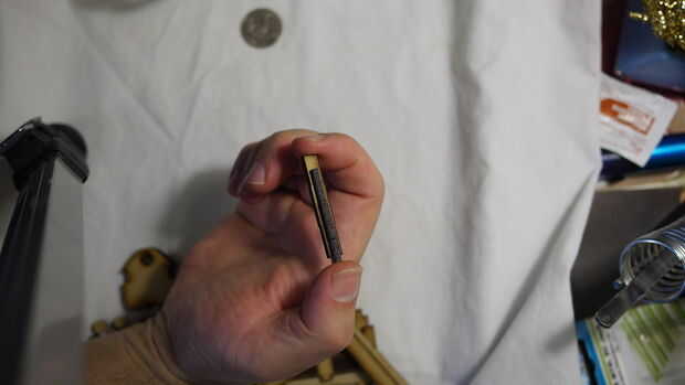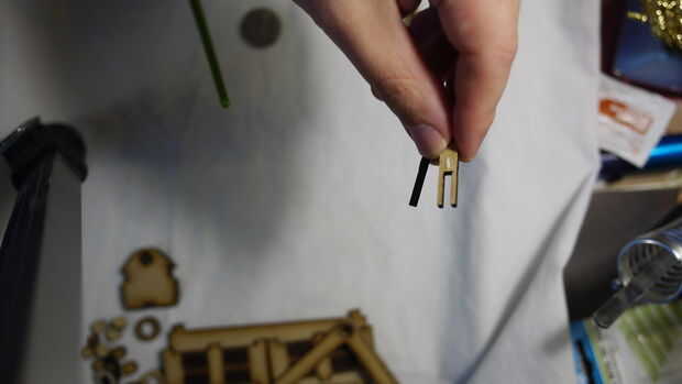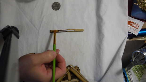 Hay dos árboles en el diseño. Las piezas parecen de diapasones y deslizarse en uno al otro. Comience con un poco de pegamento en cada lado cerca de la muesca. Yo uso un pincel para aplicar el pegamento. Poner pegamento en ambos lados de las dos mitades y diapositiva juntos. Limpie cualquier exceso de cola visible. Si dejas una gota de pegamento seco en un extremo tendrá problemas más adelante.