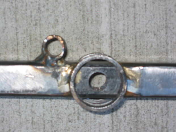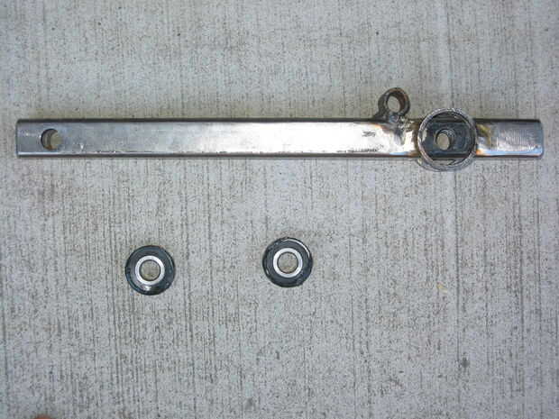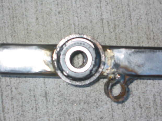-Tomar las dos piezas de tubo y los rodamientos de bolas de la cuña en ellos. Poner el árbol a través de uno, luego deslice a través de los 11 agujero de 16, luego puso el otro rodamiento del otro lado. Alinee los agujeros y rodamientos de bolas de modo que el eje se deslice dentro y fuera perfectamente y pueda girar sin pulir en el metal. Los cojinetes deben apoyarlo para movimiento suave, no el acero. Soldadura de tachuela (soldar rápidamente, sólo un pequeño lenguado) los tubos en el soporte, luego Compruebe para asegurarse de que todo se alinea a derecha. Retire los rodamientos de bolas y el eje y soldar con seguridad.