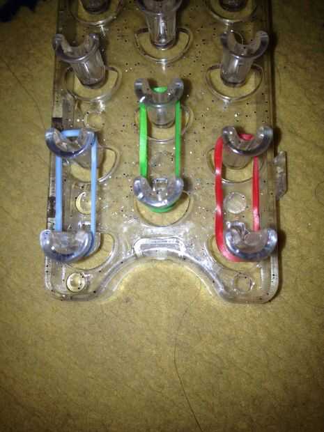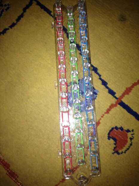 Esta es la pulsera como se verá cuando esté terminado. Yo recomiendo usar 3 colores diferentes para esta pulsera. Antes de poner las bandas en el paso siguiente Asegúrese de que doble todas las bandas, si crees que me refiero a hacer una banda de la