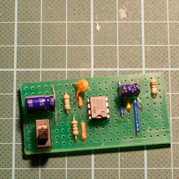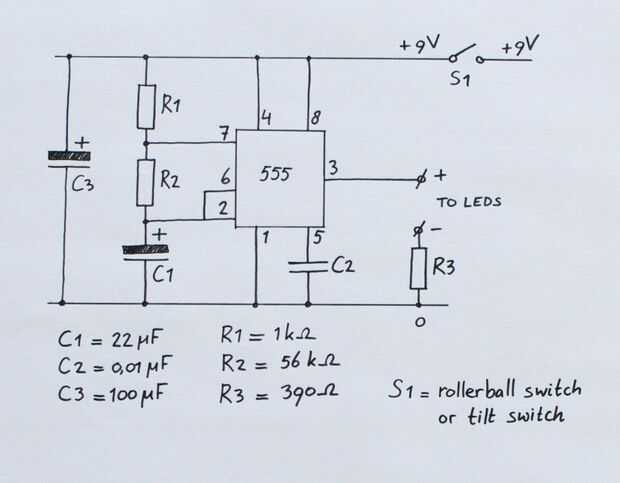 El circuito que hace que los leds parpadeen (Figura 4) es un circuito muy básico de alrededor de un temporizador 555. Esto no es la manera más eficiente para hacer el trabajo, porque el temporizador 555 consume una gran cantidad de energía para mantenerse con vida. He utilizado este esquema sólo porque tenía el pcb soldados ahí (es un remanente de un anterior I'ble que hice). En el pcb un interruptor fue soldado ya. I sustituirá este interruptor con un interruptor de bola de rodillo.