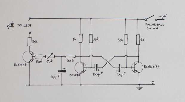 Ahora, si se construye el circuito pic 9, lo más probable es que no va a funcionar como esperaba: la forma de los leds se desvanecen y depende fuertemente de los valores / especificaciones de cuatro componentes en la parte inferior izquierda del circuito: los leds, el transistor, el capacitor y resistencias. Para hacer el ajuste más fácil, pongo un resistor variable en el circuito. Ajuste su valor influye en la forma de que los leds descolorarse adentro y hacia fuera.
