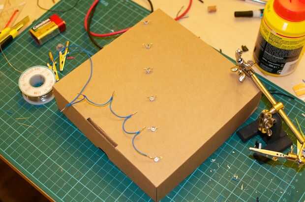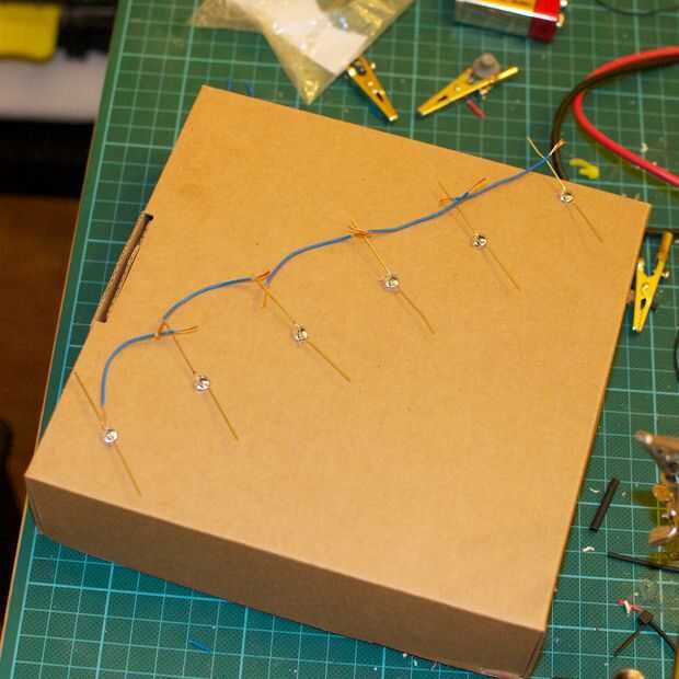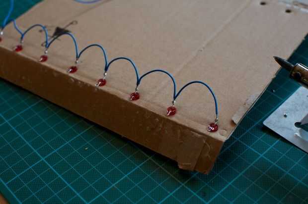 - Finalmente, la cadena de seis leds a la placa de la soldadura y el circuito de prueba.