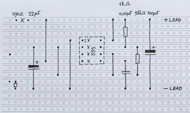 - Soldar los componentes en una pcb previamente acondicionados. Corte tiras de cobre donde se marcó con una X en el dibujo (Figura 5).