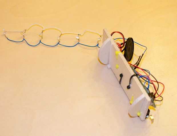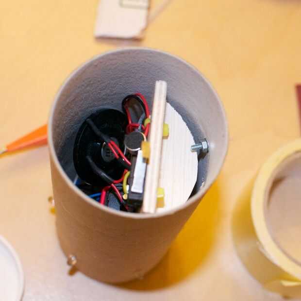 Empezar empujando los leds a través de los orificios en el tubo, de adentro hacia afuera. Entonces, espero que los cables de los leds a la placa lo suficiente y empujar el tablero de madera contrachapada con la electrónica en el tubo. Tenga cuidado de no sacar los leds fuera de sus agujeros en el tubo...