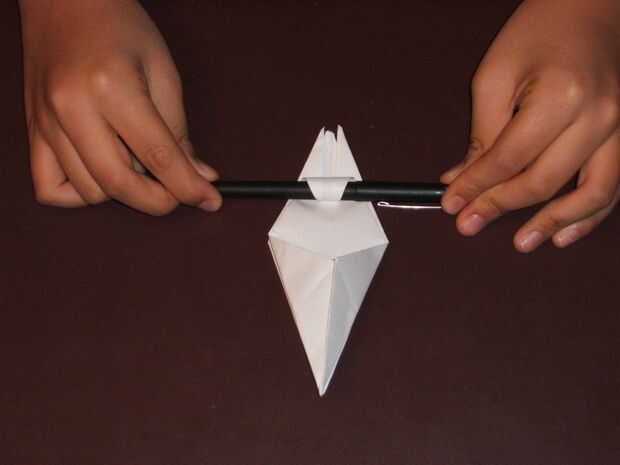 Con un bolígrafo, enrollamiento hacia abajo de las "aletas" o pétalos para hacer una bonita final a la flor. Una vez más, hacer esto a los cuatro lados.