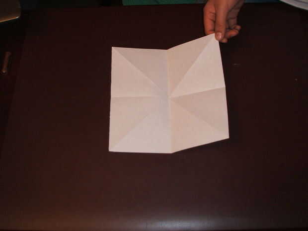 Pliegue el papel para hacer una X en el papel. Voltea el papel. La misma excepción de hacerlo en la horizontal y la línea vertical por lo que parece un +. Después de que hayas hecho todo esto, hay que desplegarlo.