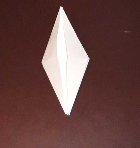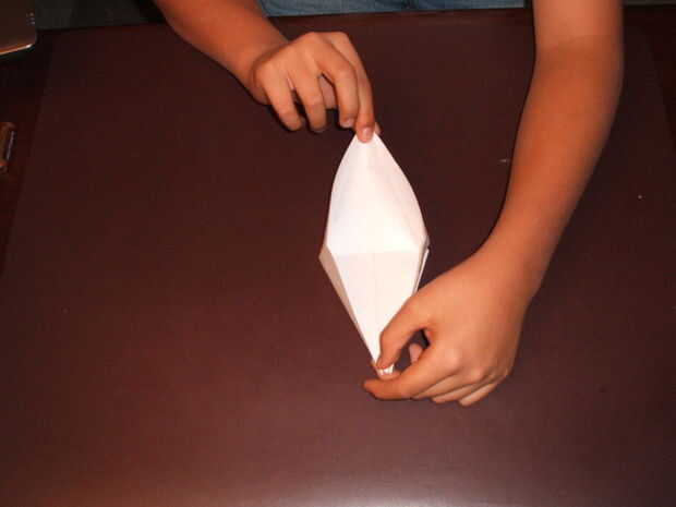 Doble primero la parte superior del papel. Ahora, por un lado, tire del papel hacia arriba y hacia atrás, como en la imagen uno. Debería verse como la imagen dos. Ahora tire completamente hacia atrás hasta que ya no puedes. Pliegue de cada lado de él para que se vea como imagen a tres.