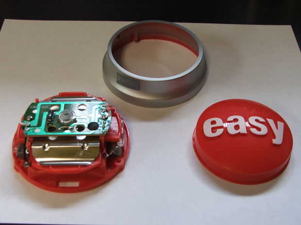 Ah, las grapas ubicuas "Botón fácil". Hay otros botones de gran cúpula, pero el botón de grapas tiene la particularidad de no necesitar un panel para ser montado en. Sólo tiene una buena base plana. Así que ¿por qué no liberar totalmente de c