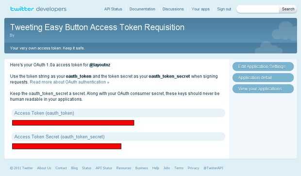 Normalmente para aplicaciones usted puede solicitar un Token de acceso y secreto símbolo de acceso para cada usuario; en este caso ya que sólo habrá un único usuario de la aplicación hay un acceso directo. En la página de configuración de la aplicación seleccione "Mi Token de acceso" para obtener un Token de acceso y un secreto de Token de acceso.