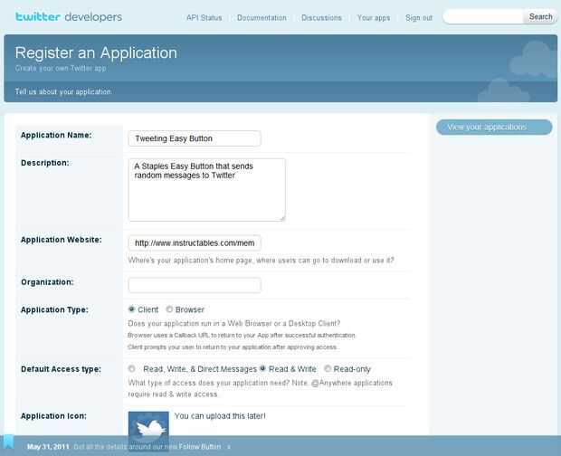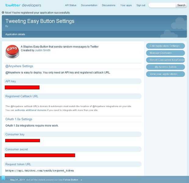 Esto crea una nueva aplicación y dará una Consumer Key y Consumer Secret.