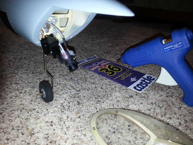 El turnigy remoto es impresionante una vez que aprendas a programarlo. Una vez que averiguar cómo tunear un servo a un palo de distancia, es fácil sólo tiene que añadir más. En uno de mis canales extras, utilizo un pequeño servo para mirar hacia arriba y hacia abajo girando un botón extra en el control remoto. Pegamento caliente del derretimiento salvó el día en el montaje de la cámara en el servo. No está seguro de su gran para la cámara, pero su solamente caliente durante unos segundos.