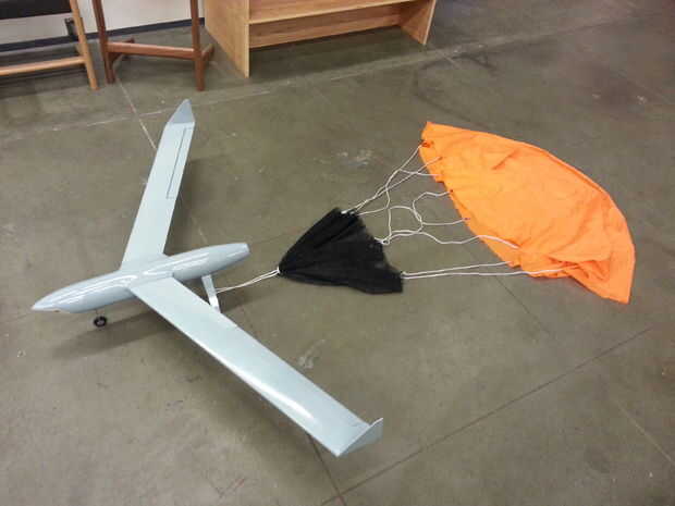 También decidí que el aterrizaje era para gente en planos. UAV no es necesario a la tierra, puede paracaídas o incluso quedar atrapados en una red. Opté por el paracaídas, con un servo con una banda elástica en lugar de un mecanismo de liberación.
