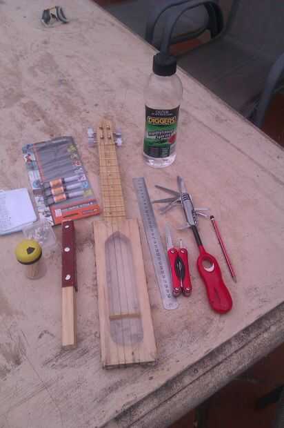 Cuando se tratan de comprar clavijas de afinación que clavijas de afinación del ukelele y guitarra no ajuste las clavijas como clavijas de afinación de guitarra son más largas, que puede significar que no funcionan tan bien en este diseño. No dude en sustituir madera pegamento para pegamento o pistola de grapas para chinchetas si tiene en su kit de herramienta o pensar en los niños puede pegamento frente a la mesa.