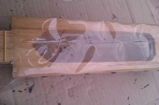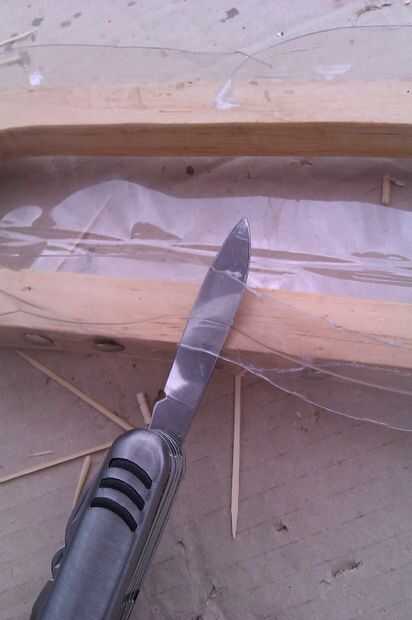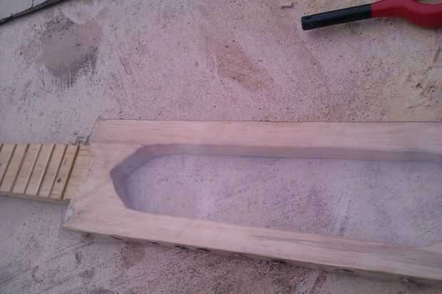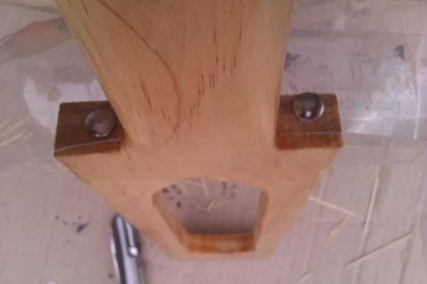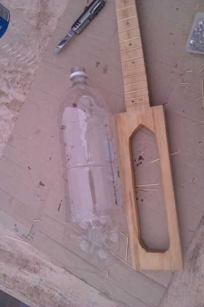 Una botella de 2.25 litros un poco más grande fue rescatada de la papelera de reciclaje, cortar por cortar la parte superior e inferior y luego corte una vez bajando por el lado. La botella se desenrolla entonces a gran tamaño. Luego fije a la parte superior de la uke con chinchetas a lo largo de los lados. La clava con tachuelas al lado del cuello asoma como matar pero en un prototipo anterior dejó sin protección a lo largo de ese borde y encontrar que tengo mucha menos tensión y volumen dentro y fuera de la parte superior. En este caso le di un poco de un recorte antes la contracción. Las tijeras de esta navaja son seriamente sub estándar.