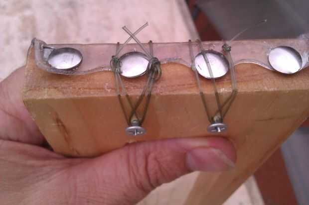 Nudos de lazo volado simple se atan en el extremo de las cuerdas y se enganchan en los tornillos en la parte posterior.