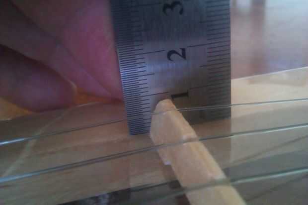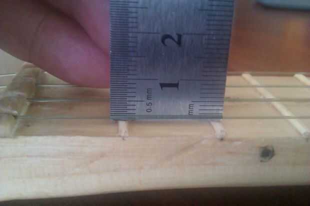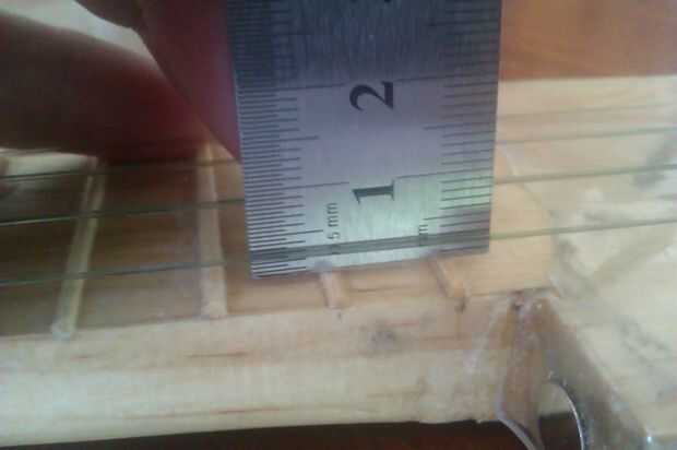Ahora que tenemos las cadenas de nos podemos afinar la acción de cortar las ranuras de la tuerca más profundo o llenándolos con pegamento estupendo si vas demasiado lejos. La altura de las cuerdas desde el primer traste es medio milímetro. Como está cerca y no lo hace realmente toque debe ser fino.