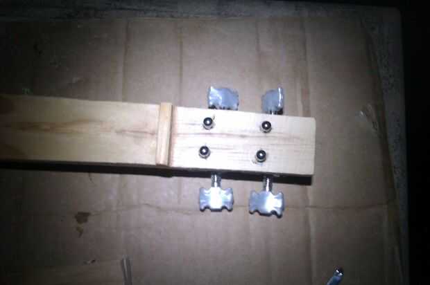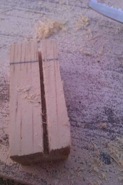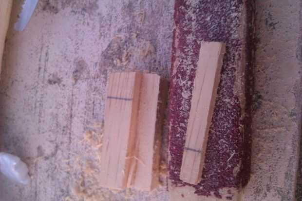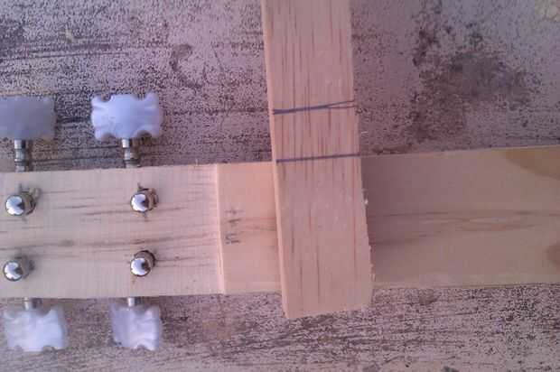 Justo ahora que tomé la herramienta lijadora que había hecho, marca el ancho del cuello en donde está la tuerca y luego sumarle el ancho de mi dedo y cortar una longitud corta para que la tuerca y el puente de. Podía haber utilizado uno de los otros recortes pero esto fue a la mano.