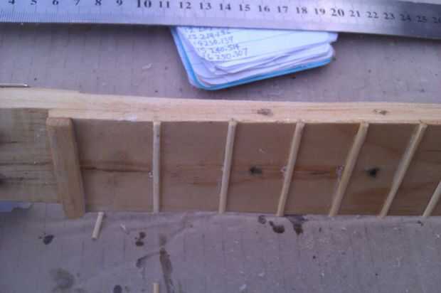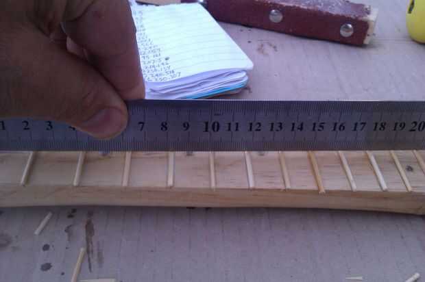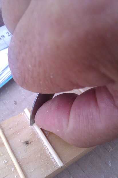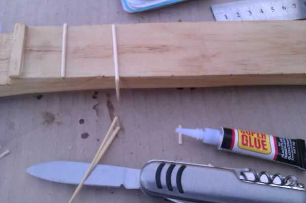 Los trastes se hacen partiendo bambú palillos usando la hoja de la navaja y ajustándolos a una longitud un poco larga que se lija a la longitud correcta más adelante. Trate de mantener un tamaño uniforme para reducir al mínimo el trabajo requerido para los de nivel más adelante. Raspar la parte posterior de los planos usando la cuchilla si es necesario.