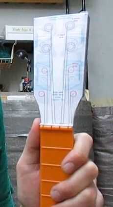 ahora recorta la forma de la cabeza de ukelele. Si estás usando un ukelele de engranaje de bugs, corte en la línea azul oscurezca y si estás usando un ukelele de makala dolphin, corte en la línea verde claro. Si está usando cualquier otro ukelele, medir el ancho de su cabeza para ver si usted debe cortar el papel un poquito más ancho o más fino (no debe variar más que 1mm) (se puede cortar de los mandos no necesita).