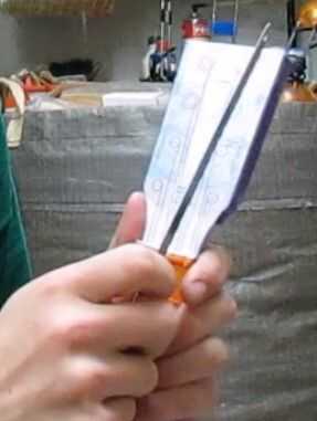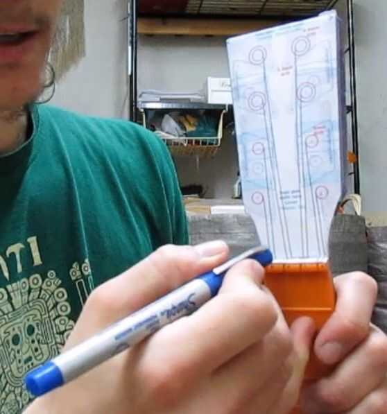 en el lugar donde la hoja se une con la tuerca (parte inferior de la cabeza), usa tu sharpie fino (lápiz permanente) para marcar precisamente donde serán las guías de cadena. es las líneas azul y gris oscuras para el engranaje de bugs y la luz verde para el makala. Si tienes otro ukelele, no hay problema: el objetivo es hacer las ranuras lo más cercano posible a las líneas rojas (que indican la posición ideal), pero si tu uke tiene una ranura que es casi donde la línea roja, usarlo en lugar de rehacerlo (sólo haga la segunda ranura 2,4 mm lejos de ella)