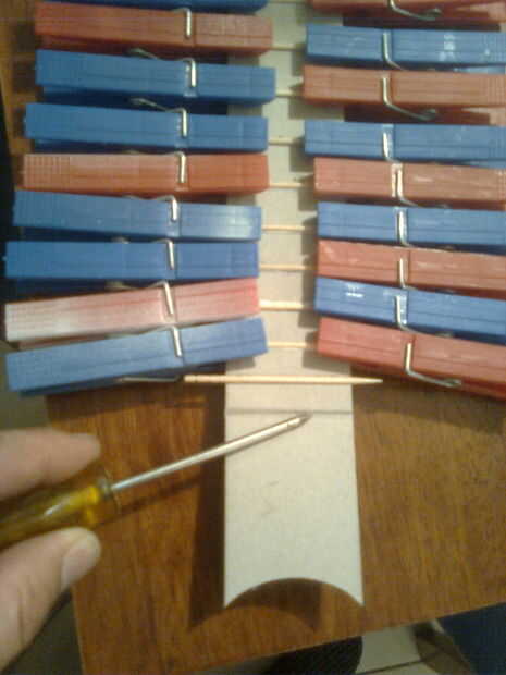 Trastes de pegamento en su lugar. Me encontré con palillos de dientes para ser el material perfecto para esto.