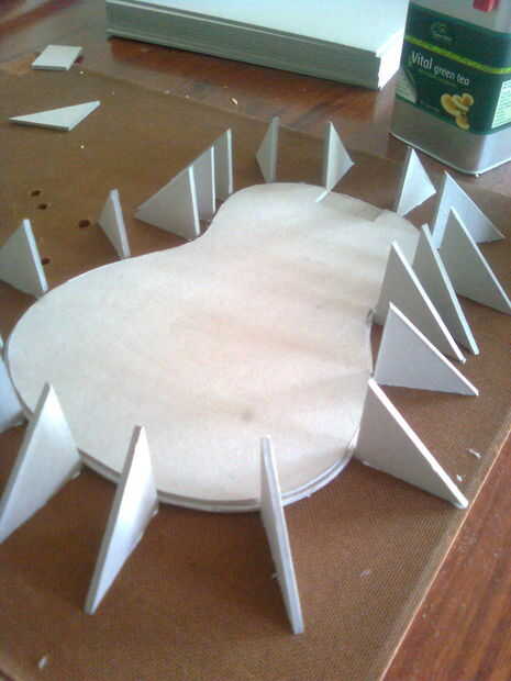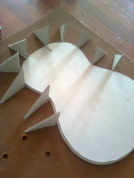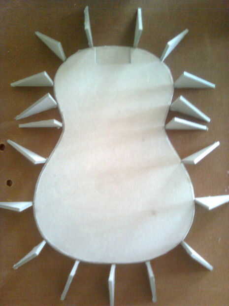 Uso de un pedazo de viejo lo suficientemente grande para acomodar la base del ukelele, más las piezas triángulo, pegar las piezas alrededor de la base como se muestra. Usé pegamento PVA para esto.