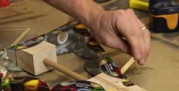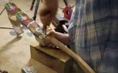 Una vez tuve mi dimensiones averiguados, me derritió las esquinas juntos (así como les clavan), atornillar el cuello bloque y cola en el cuerpo (otra vez, no taladro, utilice un soldador para hacer agujeros piloto) y luego estaba listo se superponen y epoxy CDs planas en la parte superior y espalda. También envían hacia fuera el grueso de dos cds (para los lados y parte superior) del bloque de cuello, el diapasón sería capaz de ir sobre el cuerpo.