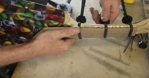 Usé algunos atajos de nogal que había dejado encima de otra construcción para cantear-una 1/2" de grosor pieza a pegar como un diapasón. Yo uso el resto del valor de corte para formar una cola para sostener las cuerdas, así como un puente (estilo del violín) y una tuerca.