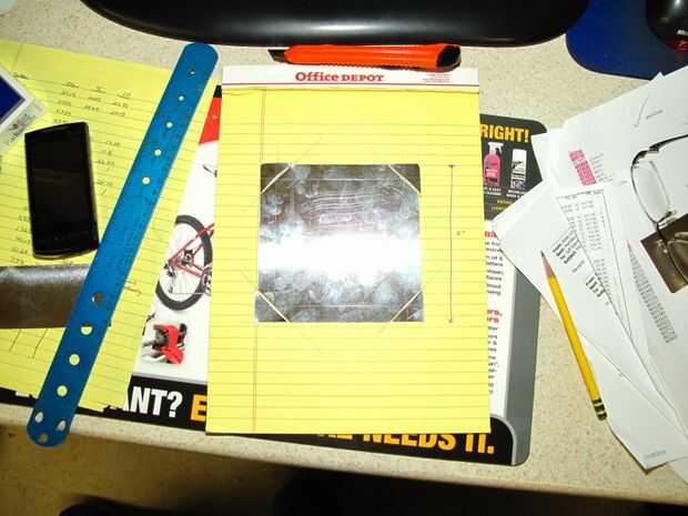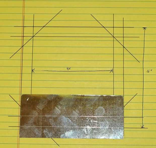 La primera parte de hacer el titular es crear a una guía que podrás usar más adelante para hacer los cortes y las líneas de puntuación. Como se puede ver a continuación, el dibujo le permitirá colocar el aluminio hacia abajo y coloque una regla sobre él para hacer las líneas de puntuación. Tomaremos una 5 "x 5" pedazo de aluminio, cortar las esquinas y doblando sobre las solapas resultantes para crear una 4" por 4" base. El punto de doblar sobre las aletas es reducir bordes afilados para no cortarse mientras que pone la foto en el lugar.