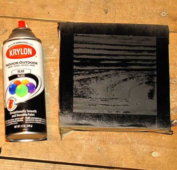 Ahora toma las secciones 7 "x 7" cortar antes y una porción del borde la cinta fuera lo tienes en algún lugar para que el pegamento para adherirse más adelante. Después de grabar de agarrar algunos pintura negra mate, spray la madera, despegue la cinta y deje que se seque. Ahora que usted tiene su cuadro titular y pieza negro plano de madera, es tiempo para atarlos juntos. En mi caso he perforado algunos orificios con un punzón y luego atornillar el soporte en la madera.