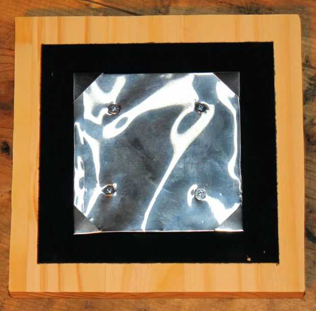Ahora, como se puede ver en la imagen 3, necesita hacer cuatro tiras de 1/2 "x 2 1/2" de aluminio para crear las fichas de esquina que sostenga la foto en su lugar. Línea de las tiras para arriba en las esquinas como en la imagen 4 y luego doblan alrededor del marco y luego otra vez debajo de las aletas de lo 4 "x 4" como en la imagen 5. Esta parte mantendrá las pestañas de la esquina en su lugar.