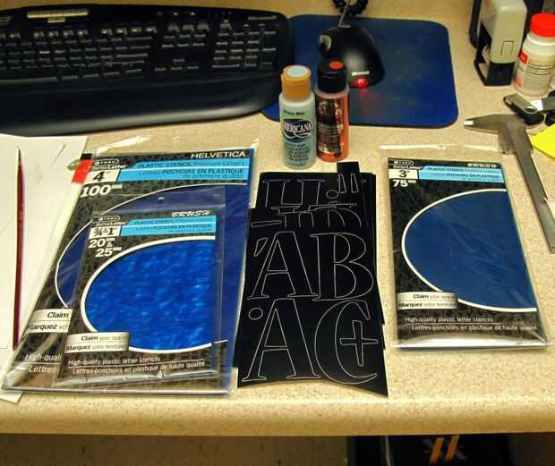 Se realizan los dos cuadros finalizados puse imágenes para utilizar este método. Primero pintar la caja completa con su capa base. Ahora uso plantillas (como se muestra a continuación) colocar un mock up de su texto y pintar cuidadosamente cada letra en. Asegúrese de medir su línea primero antes de comenzar ya que es muy difícil de improvisar.