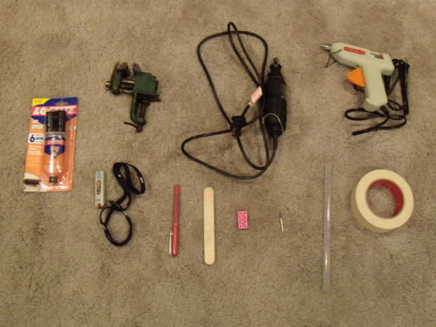 En primer lugar, tenemos que reunir el equipo de seguridad, herramientas y lo más importante, las piezas correctas. Necesita un ladrillo de Lego o Mega Blok, herramienta Dremel u otra herramienta rotatoria, un poco por la herramienta, una prensa pequeña, un pequeño usb flash drive (capacidad no importa), un lápiz o herramienta de grabado y una pistola de pegamento caliente con pegamento caliente o epoxi. Usted también necesitará gafas de seguridad y, dependiendo de lo fuerte es la herramienta rotatoria, protectores auditivos. Además, recuerde a un adulto para ayudar con la herramienta rotatoria.