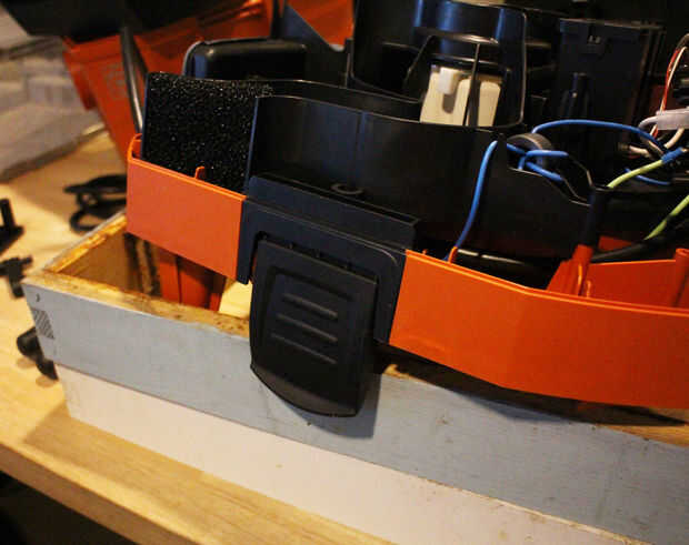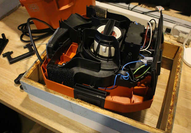 Primero abrir la aspiradora y descarta el 'cubo', asegurándose de guardar el punto de anclaje donde encaje la manguera en el cubo. Luego quitar el filtro de aire y descarta demasiado. Abra el motor aflojando todos los tornillos (guardar para más adelante) para desconectar los sensores de nivel de agua y elimine las dos torres donde se suspenden los sensores en el cubo. Entonces sacó las hebillas que sujete al motor superior al cubo. Estaba cuidadosa nota de qué sujetadores fue donde y no falta ninguna, y esto hizo fácil montar de nuevo.