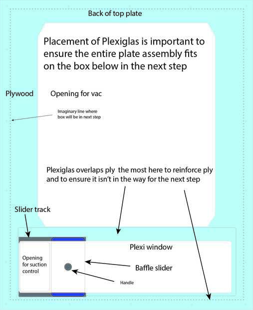 Lo importante aquí es para asegurarse de que el Plexiglas se ajusta para que se puede montar esta placa toda en su caja, así que asegúrese de que su orientación para que coincida con el esquema de jpg que he creado. Asegúrese de no tener pegamento en cualquier lugar cerca de la pista deslizante y deflectores.