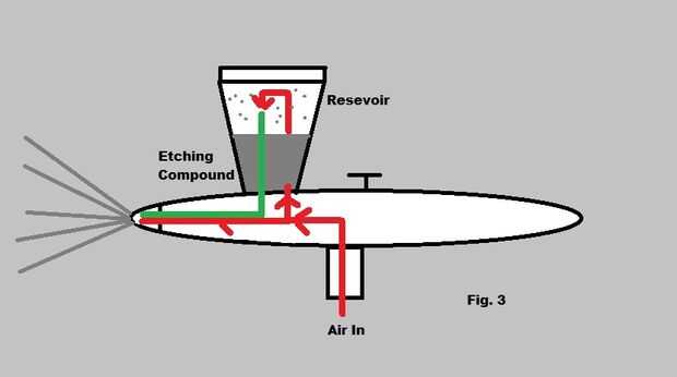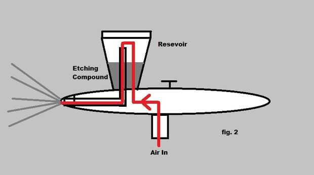 Fig.2 - aire es desviado a través de la base del depósito, agitar el compuesto en una niebla, luego soplar por un tubo hacia abajo hasta la punta.