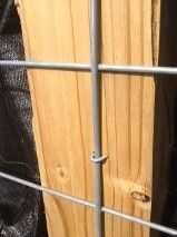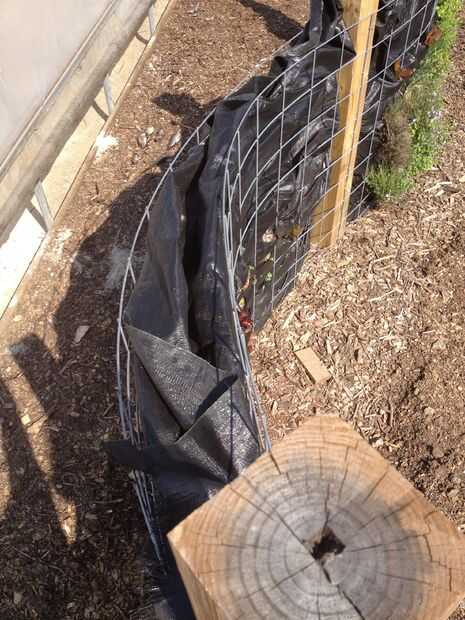 Añadir el soporte de suelo entre las dos capas de tela de la barrera de las malas hierbas. La foto muestra lo post expuesto para demostrar cómo la guía se une con esgrima grapas; siguiendo las instrucciones del post será cubierto por la tela.