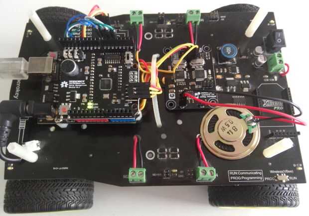 Descargar el programa, entonces usted puede controlar este vehículo con voz de una manera integral. Cuando enviamos la orden de "avance", mp3 reproducirá "ejecutar la orden de avance". Es lo mismo con otras órdenes. Una cosa vale la pena notar es que añadimos la función de "música" para este vehículo y puede reconocer varias órdenes tales como "juego", "pausa", "continuar" anterior"y" siguiente ".