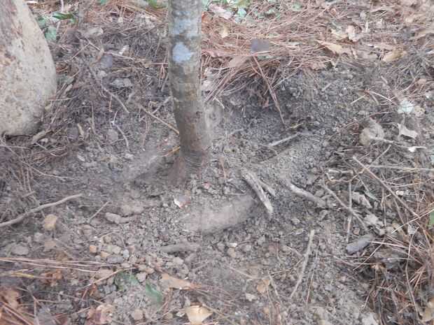 Esto puede ser más difícil de lo que parece, sobre todo porque no sabes lo que buscar las raíces hasta que desenterrar. Por esta razón, es bueno tener varios candidatos. Encontré dos plantones, que necesitaba sacar de todos modos. Generalmente yo sólo cortar hacia abajo con un machete, pero ya que yo quería hacer un personal, esperé hasta que pude moverse a cavar para arriba.