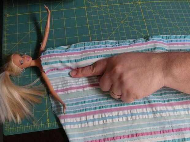 Para determinar el ancho de la tela simplemente necesita, coloque su muñeca de moda en el extremo de la tela, al final del balanceo sobre la muñeca como en la foto. Asegúrese de que la tela llega todo el busto y la zona de la cadera de tu muñeca ya que estas son las áreas más grandes. Necesitará añadir un extra 1/4 de pulgada (margen) a su medida para dejar espacio coser el vestido juntos.