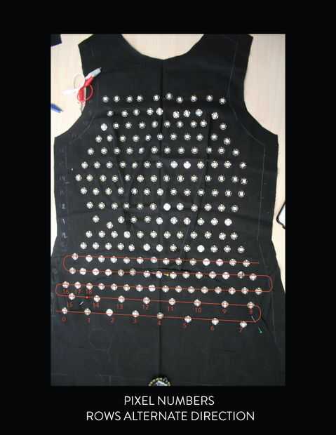 Hacer un vestido de matriz de LED programable suena simple y divertido hasta que empiece a considerar el número de unidades individual hay escribir a para la matriz sí mismo. Comenzamos con una cuadrícula recta y al final decidió hacer una cuadrícula escalonada y en forma que cabría la blusa vestido mejor. Sin embargo, esto significa que utilizando a cualquier tipo de biblioteca matriz existente no es bueno como nuestra red tenía diferentes números de píxeles de cada fila. Teníamos que decidir en esta temprana para que sea posible asignar nuestra herramienta de diseño en línea a cada píxel en el vestido real.