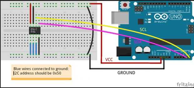 Usted puede atar con alambre hasta 7 I2C chips en la serie de memoria adicional que puede contener más de 50 animaciones! Sólo utilizamos dos, pero la Convención de numeración para estos chicos poco ocurre cuando alambre diferentes pines con alimentación o tierra. Para nosotros, hemos utilizado 0 x 50 y 0x51.