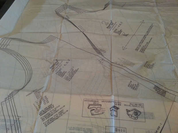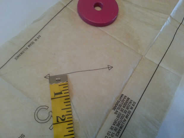 Cuadro #2 que usted probablemente verá una flecha en la pieza por lo menos 1 que está en un ángulo. Esta pieza (como se muestra en el diagrama de diseño) debe tener ese paralelo de flecha a la orilla. Coloque la pieza de patrón de papel sobre la tela como se muestra en el diagrama. NO pin que en su lugar todavía. Lugar 1 perno de la flecha (sobre mitad del camino centraa) entonces con su cinta métrica medida de flecha de un extremo a la orilla... Tome nota de que la longitud. Luego se mide desde el otro extremo de la flecha a la orilla. Esas 2 mediciones deben ser el mismo... Si no ajustar hasta que estén. Ahora pin el resto del patrón en lugar (o pesos de uso) dejando el perno de la flecha en su lugar.