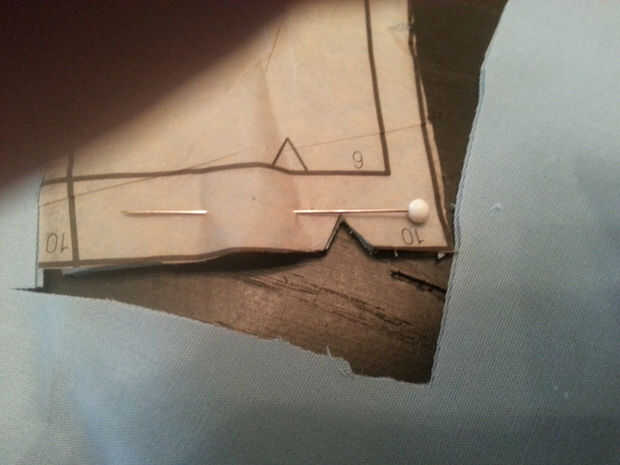 Ahora es el momento de marcar todas las piezas de su patrón, o cortar sus muescas. También teníamos que marca el revés de cada pieza de tela con un trozo pequeño de cinta adhesiva.. .esta hará mucho más fácil coser. Marcamos los puntos o círculos sobre la pieza superior de la tela para cada pieza, luego para asegurarse de que la segunda pieza fue marcada en el mismo lugar empujó un alfiler a través de la marca en el patrón. Marcamos (con tiza) donde el perno salió al otro lado.