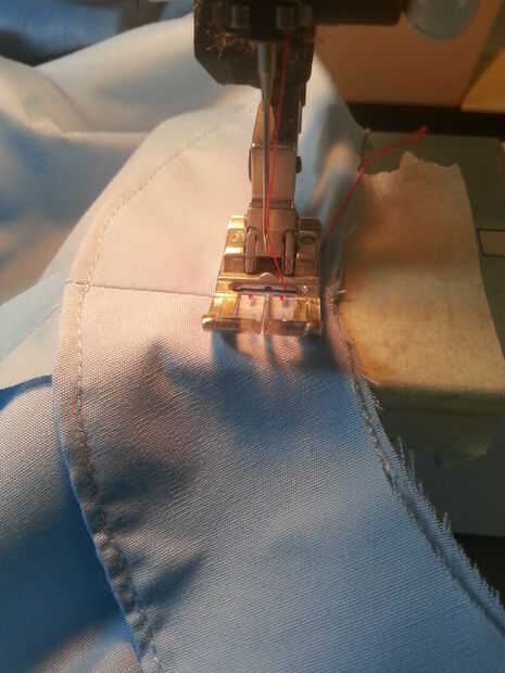 Según nuestras indicaciones en este paso será coser el revestimiento sobre el vestido con lados mal juntos. Esto es importante para poder visualizar el vestido terminado, ya que es lo contrario de lo que generalmente coser (con derecho)