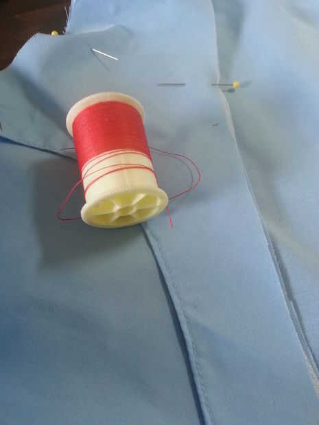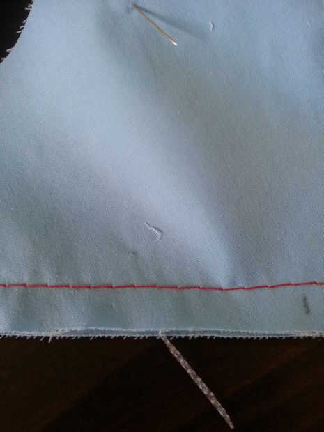 Las instrucciones nos dicen para coser con una 3/8" de la costura no la habitual 5/8" costura. Estamos usando una longitud de puntada L-O-N-G (puntada de hilván) y contrastando colores hilo (en este caso rojo). Vamos a eliminar los hilvanes más tarde y mediante el uso de algún otro color (cualquier color) hará ver/quitarlo mucho más fácil.