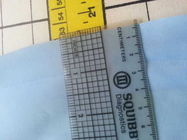 Este dobladillo que sólo queremos un dobladillo estrecho 1/2" para que me lo quitaron todo menos 1 pulgada de la tela sobrante (doblada para arriba para el dobladillo)... use su cinta de medir para que mantenga este recto e incluso (pic #2). Una vez que han cortado a la tela sobrante fuera, y te queda sólo 1 pulgada, doble el borde cortado del dobladillo interior emparejar a la línea de doblez en que ya ha planchado... Hierro nuevo (Foto #3). Ahora todo lo que tienen que hacer es puntada el dobladillo en el lugar y listo