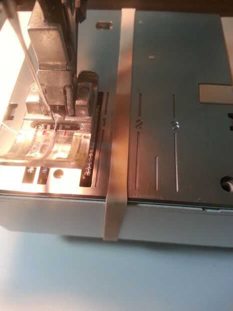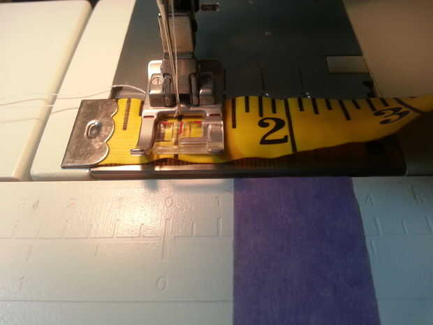 - Qué costura ancho permiso le será coser (más nos patrones comerciales para la construcción de prendas de vestir utilizan un 5/8" margen de costura... Que cada vez es más allá de mí... lo más tonto siempre en mi humilde opinión) el término Margen de costura es el área entre el borde de corte de borde crudo de la tela y la línea de costura (pic #2). Antes cosa sugieren la medida usted (en su equipo) de donde es el punto de aguja, a la derecha de la aguja 5/8" y el lugar un trozo de cinta adhesiva (Foto #3)... Me gusta con la colorida cinta de enmascarar de pintores (es morado)... o si tienes un brazo abierto en su equipo puede utilizar una banda de goma (ver foto #4) para marcar el margen de costura.