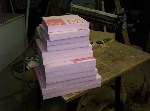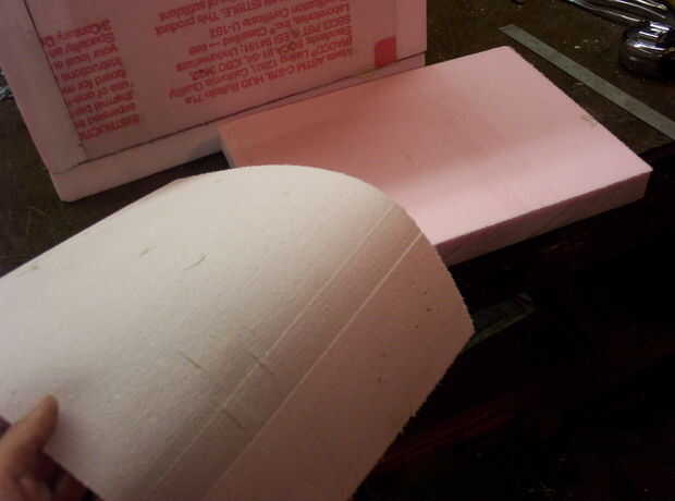 Todos los tamaños de panel fueron cortados en un brazo radial vieron, aunque uno podría hacerlo fácilmente con una sierra circular o un cortador de hilo caliente. Yo podría haber hecho un poco mejor algunas de las piezas, pero el mayor problema era mis medidas. Es que la hoja se inclinó y los bordes no eran perpendiculares y radiales. Asegúrese de conseguir una hoja plana, especialmente si su cartón pluma es más gruesa.
